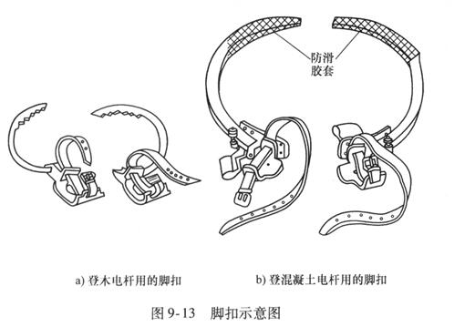 腳扣又稱鐵腳,是電工攀登電桿的主要工具。腳扣分兩種:一種扣環(huán)上帶有鐵齒,供登木桿用;另一種在扣環(huán)上裹有橡膠,供登混凝土桿用。腳扣的結(jié)構(gòu)如圖9 - 13所示,用腳扣攀登電桿具有速度快、登桿方法簡便等特點。